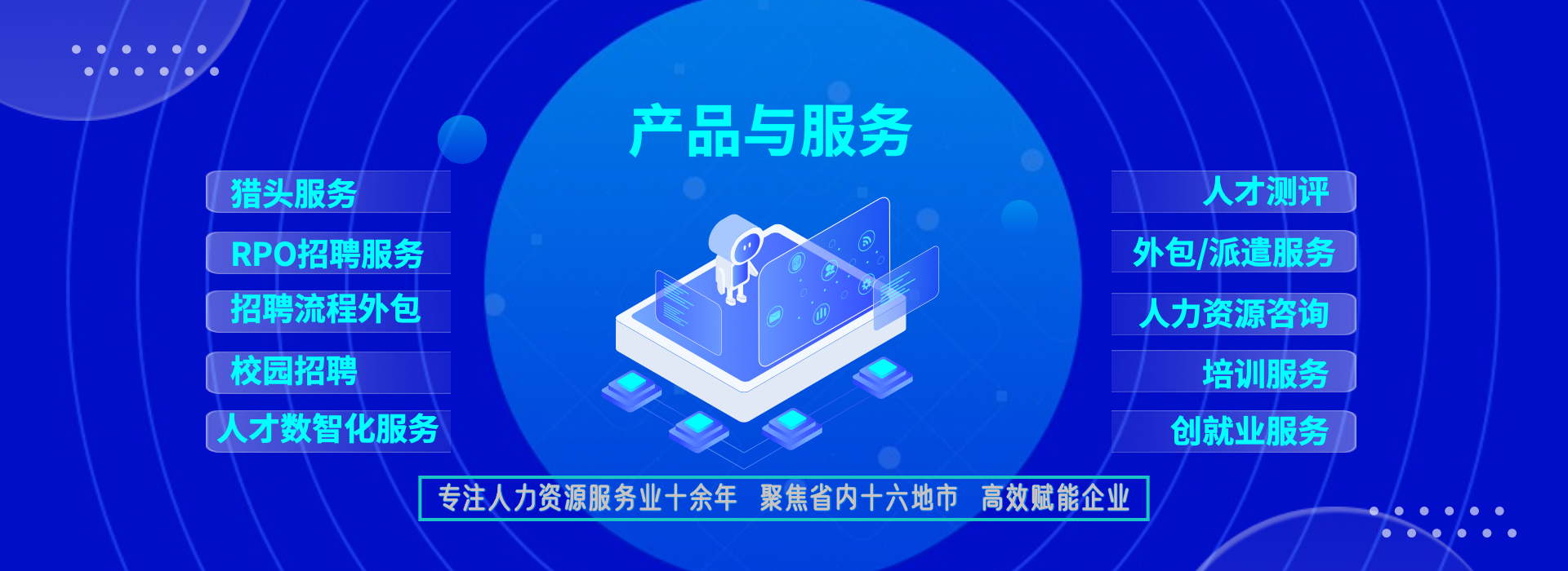一站式服務,降低企業管理成本 事務外包:人事事務外包,實習生招聘與管理外包 崗位外包:IT技術、財務/會計、行政文秘類和市場類崗位 項目外包:校園招聘外包、招聘流程外包、社交媒體運維外包、設計創意外包 業務流程外包:物業管理項目外包、零售快消行業的營銷服 務外包、倉儲物流業的倉儲與配送外包、O2O地推營銷外包、 呼叫中心外包等